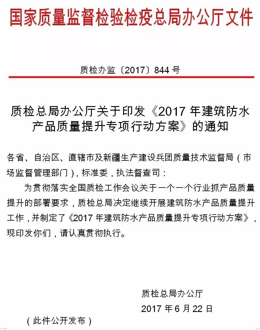 近日,国家质检总局办公厅印发《2017年建筑防水产品质量提升专项行动方案》,对2017年建筑防水产品质量提升专项行动进行部署。